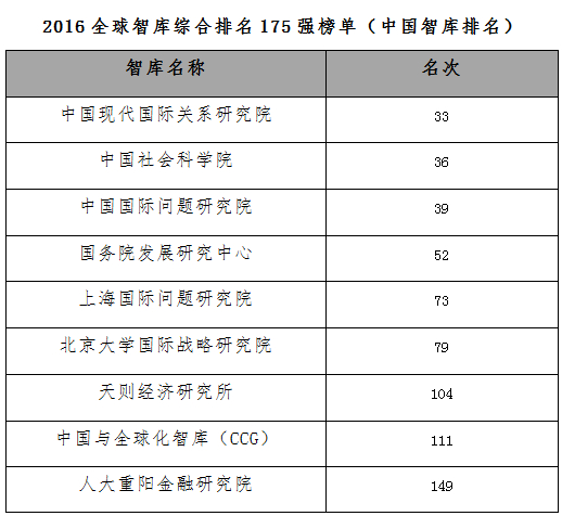 2016全球智库综合排名榜单175强中,有9家中国智库入选,分别是:中国现代国际关系研究院(第33名)、中国社会科学院(第36名)、中国国际问题研究院(第39名)、国务院发展研究中心(第52名)、上海国际问题研究院(第73名)、北京大学国际战略研究院(第79名)、天则经济研究所(第104名)、中国与全球化智库(第111名)、人民大学重阳金融研究院(第149名)。