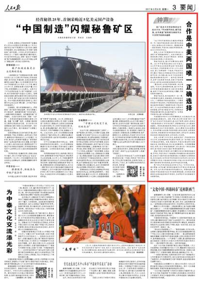 人民日报:合作是中美两国唯一正确选择