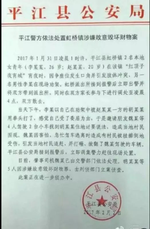 2017年1月31日凌晨,在虹桥镇“红顶子夜宵城”吃夜宵的2名女青年(李某某,26岁;赵某某,20岁;)并非江西游客,是虹桥镇本地人,双方因纠纷发生肢体碰撞后报警,经当地派出所工作人员召集双方家长到派出所作了调解处理。因李某以自已在劝架中被赵某一方的胡某用拳头打了,感觉受了委屈,当天下午邀请魏某等人驾车到虹桥镇东安村,讨要说法,造成群众围观,由于对方人多,魏某驾车离开现场途中,造成群众被拖拽倒地,引起群众追赶、围攻、打砸车辆、将车辆掀翻,该江西牌车辆是本地人魏某所有。平江县公安机关已派出刑侦大队、治安大队等精干力量对此事进行立案调查处理,并于2017年2月2日将案件初步调查的基本情况已向社会公布。