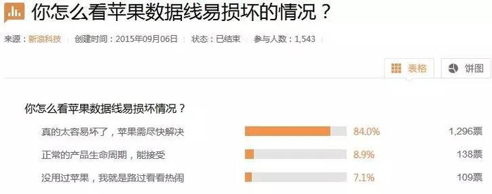 每日经济新闻(微信号:nbdnews)记者在网络上以“苹果数据线的质量”作为关键字搜索了一下,发现反映苹果数据线容易损坏的用户非常普遍,在新浪微博上一份关于“你怎么看苹果数据线易损坏情况?”的调查问卷结果也证实了这点,根据1543人参与投票的结果显示,约84%的用户认为苹果数据线“真的太容易坏了,苹果需尽快解决”。