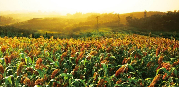 “暑气蒸腾,在川南丘陵间。成熟的高粱顺着地势的起伏,无际无边……捧起一把高粱米,摊在掌上,吹去谷壳,象牙白里透着胭脂红的高粱米,一粒粒圆润如玉。把鼻子凑近,就闻到谷粒的芳香……”作家阿来曾经为糯红高粱所震撼,他站在原野上,听见美酒在风的血管中奔跑的声音。