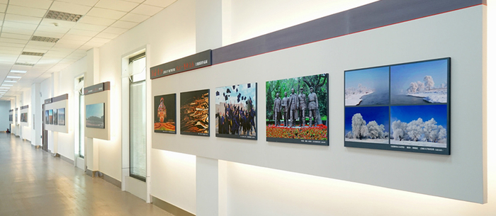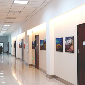 沿着走廊台阶,拾级而上。百余幅摄影作品分布馆内一、二、三层楼的走廊,《白鹿洞书院学规》《曾国藩家训》《师说》,大型诗书、古文、书法、壁画点缀期间。这一切都展示着“走南闯北”的地学人聚焦的缤纷世界和严谨治学的科学精神。而利用墙壁制作作品的背板变得立体而又不显笨重、累赘,走廊顶部的节能灯和作品背板灯带的光亮十分柔和,使得每一幅作品更加清晰、靓丽。长廊即走廊,走廊即长廊,二者融为一体,巧妙结合,相得益彰。这正是设计者的奇思妙想、匠心独运。
