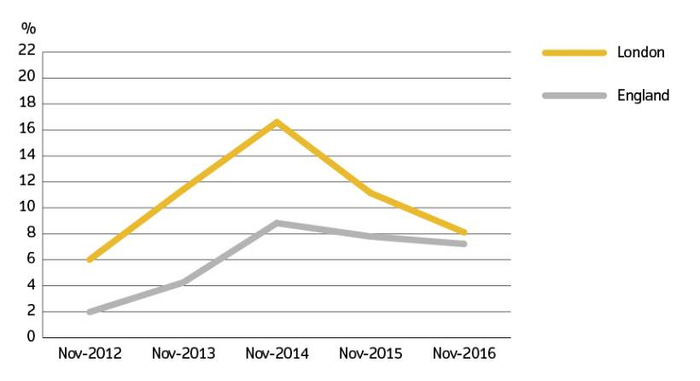 ▲2012年11月~2016年11月伦敦和英格兰房价同比增幅走势(数据来源:英国统计部门)