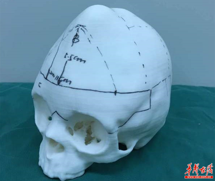 医生一比一立体重建宜佳的颅骨模型,实施精准修复手术。