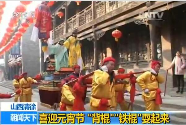 在山西清徐县徐沟镇,当地群众耍起了“背棍”、“铁棍”。背棍有八十多斤重,成人背在肩头,表演的孩子们双腿绑在棍上,随着背棍人的舞步摇摆水袖,动作好不好看,全靠两人的配合。这背棍后面就是铁棍队伍,铁棍好似抬轿子,木阁上以各种亭台楼阁造型为背景,孩子们扮成传统古装戏中的人物,固定好双脚站在上面,随着铁棍抬棍人的动作调整舞姿,棍上棍下节奏一致,行云流水,给观众美的享受。