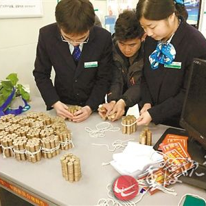 2月6日上午8点半左右,农业银行重庆分行云阳支行刚开门不久,就接到一项特殊业务:一位矮瘦、衣着朴素的小伙子,拖着3只鼓囊囊的购物袋走进银行。