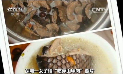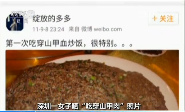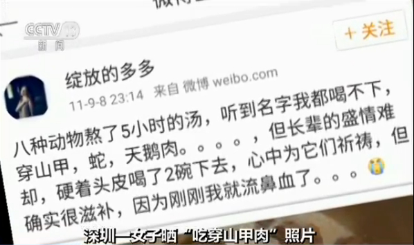 在“绽放的多多”2011年9月8日所发的微博里,记录了这样一顿宴请:“八种动物熬了5小时的汤,听到名字我都喝不下,穿山甲,蛇,天鹅肉……但长辈的盛情难却,硬着头皮喝了2碗。心中为它们祈祷,但确实很滋补,因为刚刚我就流鼻血了……”时隔十分钟后,这名网友再发微博晒出图片,表示自己“第一次吃了穿山甲血炒饭”,“很特别”。而半年之后的2012年3月6号,“绽放的多多”再次发布微博称,她喝到了“炖了四小时的冬虫夏草穿山甲汤”,味道“非常美味”。之后的几个月里,她在微博还发布过活着的穿山甲和猫头鹰的图片。而这些多年前发布的微博信息,在最近备受关注的广西穿山甲事件发生后,也被细心的网友们发现,并公之于众。