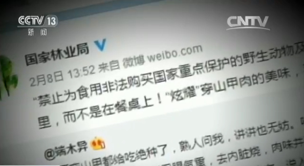 同样没有放过这条旧闻的,还有国家林业局。2月8日,该局官微连发两条微博表明态度:“禁止食用非法购买国家重点保护的野生动物及其制品”。它们,应该是在森林里,而不是在餐桌上!“炫耀”穿山甲肉的美味,就是在“炫耀”自身的残忍和无知!