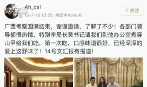 对于“广西官员请吃穿山甲”一事,2月8号,广西壮族自治区纪律检查委员会通报:参加宴请的公职人员,只有自治区高校工委统战部原部长李宁一人。李宁已于2016年5月因涉嫌受贿罪被检察机关依法逮捕。关于该宴请是否食用国家二级保护动物穿山甲的问题,相关执法部门正在进一步调查处理。