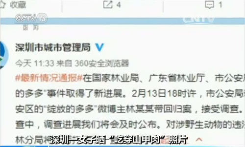 深圳市城市管理局官方微博发布了网友“绽放的多多”食用穿山甲事件的最新情况通报