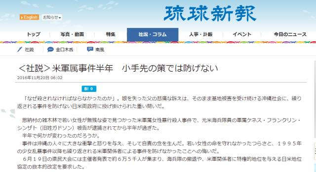 《琉球新报》曾发表社评称,小小的冲绳却承载了4.7万驻日美军及其亲属,岛袋里奈事件给以冲绳民众巨大打击和愤怒。还有深深的自责,冲绳连自己年轻女孩的生命都无法保护,事件的根本起因就是驻日美军基地的存在,日美两国政府应该正是遗属的愿望,早日撤销美军基地。
