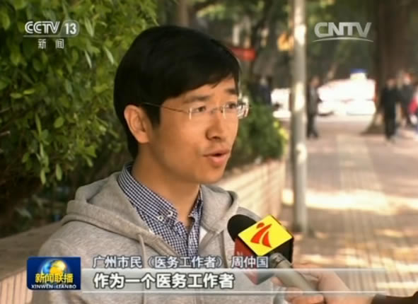 广州市民(医务工作者)周仲国:我作为一名医务工作者,我看到了一条关于报道,一位 武汉同济医院92岁高龄的大夫,坚持每个星期出三次门诊,我想这种精神也是坚定了我自己还有我身边的一线医务工作人员继续更好地为普通老百姓服务,去做一些事情。