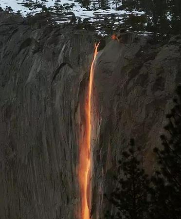 优胜美地国家公园位于加州北部,每年2月中旬,公园内的马尾瀑布(Horsetail Fall)会有几天出现“火瀑布”奇观。在特定角度下,阳光照射在瀑布上形成的光学效果,会让从悬崖上飞泻而下的水,看上去如同岩浆一般。