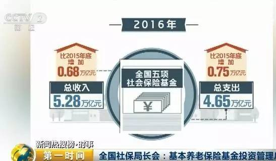 人社部数据显示,2016年,全国五项社会保险基金总收入为5.28 万亿元,总支出为4.65 万亿元,分别比2015年底增加0.68万亿元、0.75万亿元。