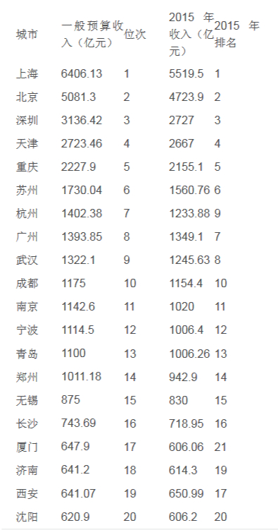 表 2016年地方一般公共预算收入前20强