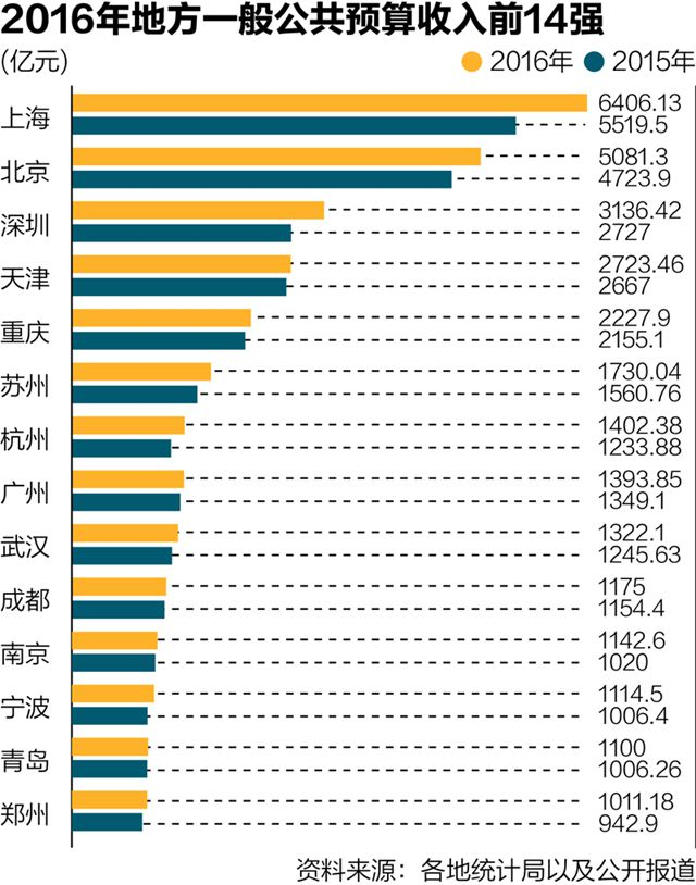 2016年,主要城市的钱袋子收入如何?第一财经记者通过对一般公共预算收入最高的20个城市的统计梳理发现,2016年已有14个城市的地方一般预算收入超过了千亿大关,其中上海以6406亿元高居榜首;在前10名中,最大的变化就是杭州赶超了广州;经济总量第3的广州,地方一般公共预算收入仅位居第8位。