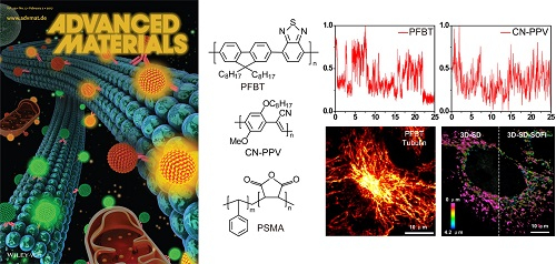 为了进一步提高超分辨成像的各项指标,迫切需要高量子产率、超高光稳定性和优异的生物兼容性荧光探针。日前,北京大学生物动态光学成像中心孙育杰课题组联合吉林大学吴长锋课题组在国际上首次研发成功适用于统计型超分辨成像的小尺寸光闪烁半导体聚合物量子点(Pdots)。该探针具有高亮度、超高光稳定性和优异的生物兼容性等优势,并可以特异性地对生物亚细胞结构进行高密度标记。该项工作成功获得超分辨率光学波动成像(SOFI)结果,打开聚合物量子点超分辨成像的新领域。最新研究成果在国际权威刊物Advanced Materials(《先进材料》,IF:18.96)上作为封面文章在线发表,同时被所有审稿人均评为VIP(Very Important Paper)文章。