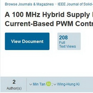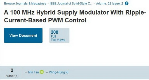 新闻网讯 近日,微电子学与集成电路领域国际顶级期刊《固态电路学报》(IEEE Journal of Solid-State Circuits,简称JSSC)上登载了我校光电信息学院谭旻研究员与香港科技大学暨永雄教授合作发表的论文“A 100 MHz Hybrid Supply Modulator With Ripple-Current-Based PWM Control”。谭旻为该文章的第一作者。这是我校历史上首次以第一作者单位在JSSC上发表论文。