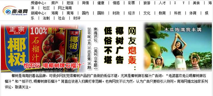在海南最大的媒体南海网上,至今仍保留着关于椰树低俗广告争议的页面。在一则海南低俗广告的调查中显示,海南“最臭广告”一项中,椰树石榴汁票数最高,占41.4%。而在“你对海南的低俗广告有何感受”一项中,选择反感的占了83.1%。