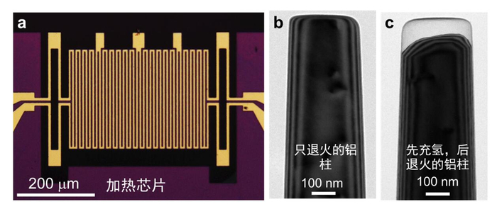 针对市场上原有原位电镜加热装置样品热漂移大、温度控制精度差、样品制备困难的问题,西安交通大学材料学院微纳中心的博士生李蒙在导师单智伟的指导下,与沙特国王科技大学的张西祥教授合作,成功研发出了一种新型的原位电镜加热装置。这一装置不仅具有热漂移率优于市场上所有同类装置的特性,而且可以方便地在高温下对从宏观样品制备的样品进行原位定量加热并实时观察样品微观结构随温度变化的全过程。利用这一独特设备,选取铝单晶作为模型材料,李蒙和解德刚博士在环境透射电镜中研究了充氢后的微纳尺度铝柱在加热过程中界面结构演化的全过程。实验发现,在升温过程中,铝-氧化铝界面处会首先形成很多含氢纳米空腔并且这些纳米空腔会逐渐合并长大; 但出乎意料的是,当温度超过某一临界温度后,这些纳米空腔会逐渐缩小直至消失,同时会在样品某些位置快速形成巨型空腔。值得特别注意的是,此时样品表面依然保有原有的形状,且常规观测条件并不能发现这些空腔的存在。实验进一步发现,电子束辅助充氢过程还会在金属内部形成大量过饱和空位,这些过饱和空位会和钻进金属内部的氢原子结合形成氢-空位对。在室温下,这些氢-空位对相对稳定,移动性很弱,然而,在超过临界温度后,这些氢-空位对会分解并快速移动到界面处,进一步破坏金属-氧化物界面,并在界面上形成一个金属长程扩散的“高速公路”,最终导致巨型空腔的形成。上述发现对研发和制备高温抗氢损伤材料具有重要的指导意义。