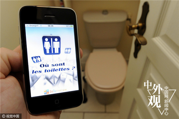 2009年12月10日,法国南锡,一款苹果iPhone手机的应用程序能让用户轻松找到附近的厕所位置。Alexandre MARCHI/视觉中国