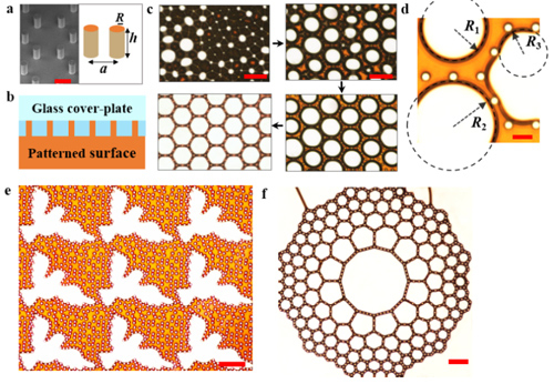 在上述研究的基础上,他们发现这种带有微米结构的模板可以用于调控二维泡沫的演化。研究表明,在泡沫中的气泡生长演变过程中,微米结构可以对气泡的表面曲率半径进行调控, 进而有效地调控泡沫的演变过程。通过微结构的调控,可以使得气泡的曲率半径不再随体积的增大而增大,甚至出现减小的情形。对应的演变也由原来的“弱肉强食”变为了“限富济贫”的反奥斯瓦尔德熟化演变模式。通过改变微结构的几何排列,泡沫会演变成所设定的图案,从而实现二维泡沫演化的“可编程性”(图1)。