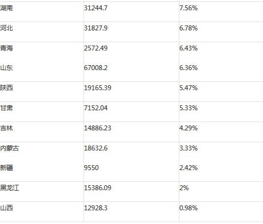 在榜尾,名义增速位居后10位的省份全部位于北方,主要来自东北、华北、西北地区,有5个省份的名义增速低于5%,分别是山西、黑龙江、新疆、内蒙古和吉林。其中山西的名义增速仅为0.98%,黑龙江的名义增速也仅为2%。