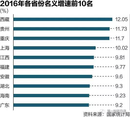 通过对于30个省份(辽宁数据不具同比性,故未纳入统计)名义增速的统计发现,2016年,名义增速最高的3个省份为西藏、贵州和重庆,均超过11%,从地理位置上看,它们全部位居我国的西南地区。