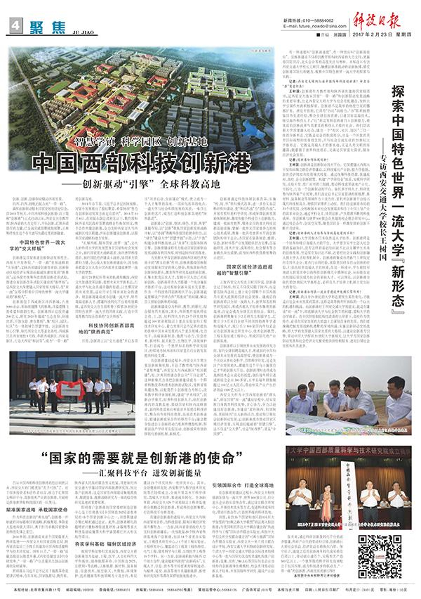【编者按】2月23日《科技日报》整版聚焦中国西部科技创新港,以“中国西部科技创新港——创新驱动‘引擎’全球科教高地”为题,展示创新港服务国家创新驱动发展的战略出发点;以“探索中国特色世界一流大学‘新形态’为题,围绕创新港建设理念专访西安交大王树国校长;以“国家的需要就是创新港的使命”为题,展示创新港科技创新大平台。