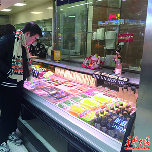 2月22日中午,星沙卜蜂莲花超市内,十余盒三文鱼中段切片摆在冷柜里出售,一位男性顾客正在挑选三文鱼。记者 朱蓉 摄