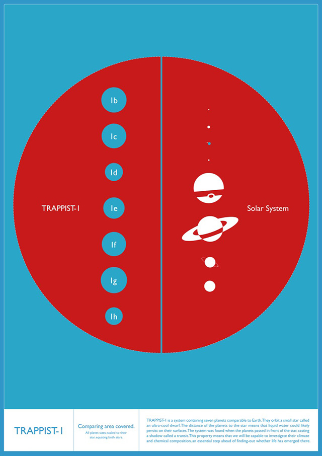 据了解,这个“迷你太阳系”中的恒星TRAPPIST-1是一颗低温红矮星,其直径只有太阳的8%。假设站在行星的表面,只能接收到地球上所获得阳光的200分之一。不过由于行星距离恒星十分近,因此所获得的能量足够保持体温。