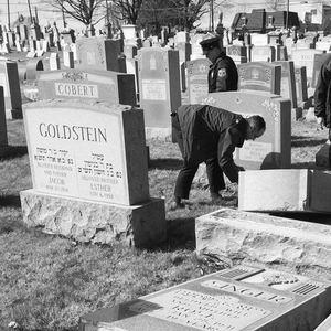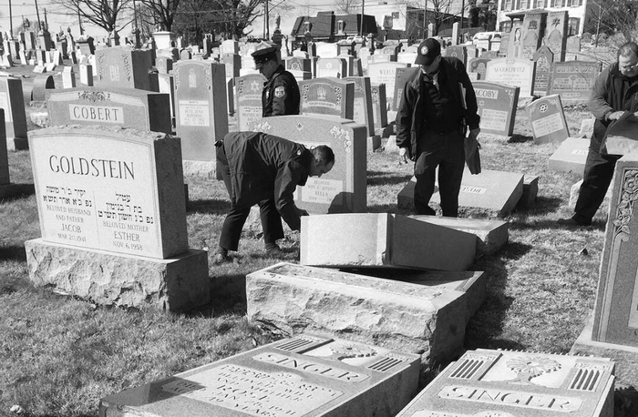26日上午,费城警方开始对这起恶性事件展开现场调查(如图)。根据初步了解,被损毁的墓碑超过100座。但有媒体报道说,如果算上被移位的墓碑,受损总数应该超过500座。警员思拉什认为,此事性质已经超越普通的公共破坏行为:“难以置信……这是性质恶劣的犯罪!”当地犹太学者泽维特告诉媒体:“这不是‘随机行为’……一次性弄倒这么多墓碑,显然是有目的的集体行动。”