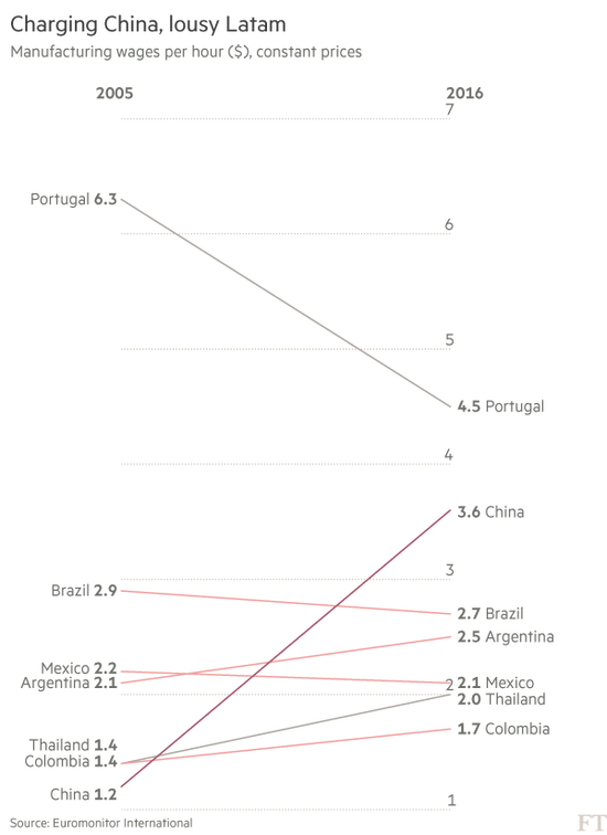 国际欧洲监测的数据显示,在经历持续10年的快速上涨后,中国制造业2016年平均时薪涨至2005年水平三倍,达到3.6美元(约合24.7元人民币),而同一时期,巴西的时薪却从2.9美元降低到2.7美元;南非也从4.3美元降低到3.6美元。