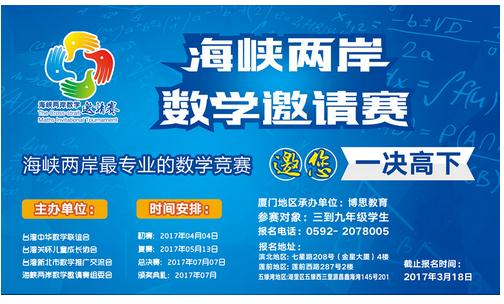 2017年第六届“海峡杯数学邀请赛”厦门地区初赛将于4月4日开考,目前,厦门赛区报名活动已火热开启。作为海峡两岸最为专业的数学竞赛活动,本次活动受到两岸社会各界和家长的高度重视。根据组委会了解到,今年海峡杯以3-9年级为参赛对象,分为海选赛、复赛和总决赛,总决赛将于7月初在厦门大学举行,届时将有一千多名两岸选手汇聚厦门,一决高下。据厦门地区承办单位博思教育的负责人解析,海峡杯相比其他数学杯赛,知识点覆盖全,题目非常经典。海峡杯的试题具有一定的难度,但是其试题不完全是难,而是巧妙,真正能学懂的人不但能开阔思路,对中小学的理科学习也有极大帮助。