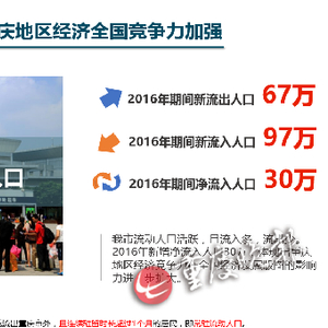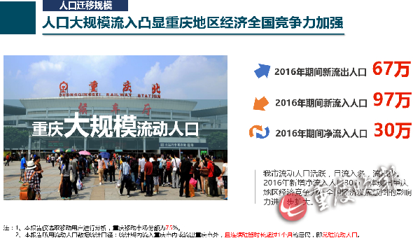 《报告》显示, 2016年期间新流出人口 为67万,新流入人口 97万,如此一来, 2016年期间全市净流入人口30万。如果算上其它电信运营商的数据,去年重庆人口净流入的数据还不止这个数。
