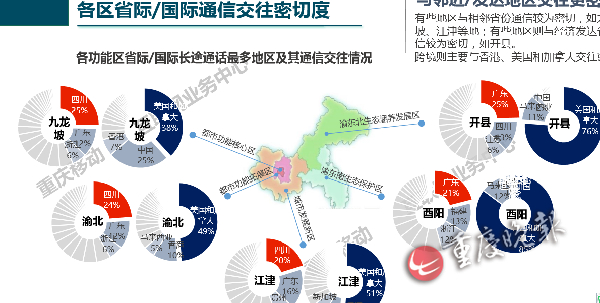 而在各区省际/国际通信交往密切度方面,有些地区与相邻省份通信较为密切,如九龙 坡、江津等地;有些地区则与经济发达省份通 信较为密切,如开县。 跨境则主要与香港、美国和加拿大交往密切。(重庆晚报记者 万里 )