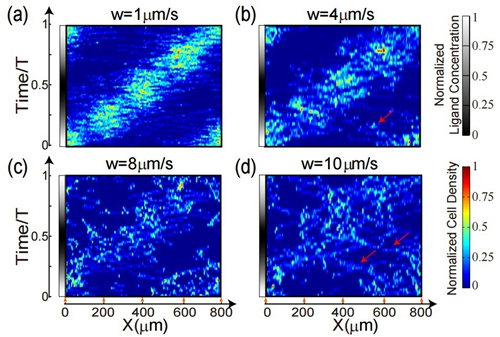 细菌在行波条件下迁移的时空图该工作细致讨论了细菌在运动的化学浓度场下的“势阱间跃迁行为”的相关因素及对细菌群体迁移速度的影响。文章以“Barrier Crossing in Escherichia coli Chemotaxis”为题于2017年2月28日在线发表于Physics Review Letters(PRL)杂志,并被美国物理学会(American Physical Society,APS)出版的Physics杂志作为“News Story”进行报道。