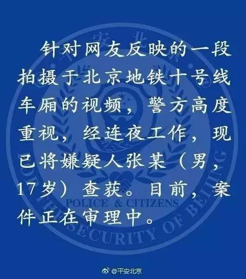 5日早上,@平安北京发布通报称,针对网友反映的一段拍摄于北京地铁十号线车厢的视频,警方高度重视,经连夜工作,现已将嫌疑人张某(男,17岁)查获。目前,案件正在审理中。