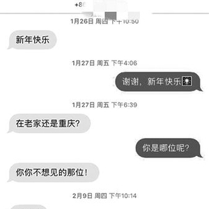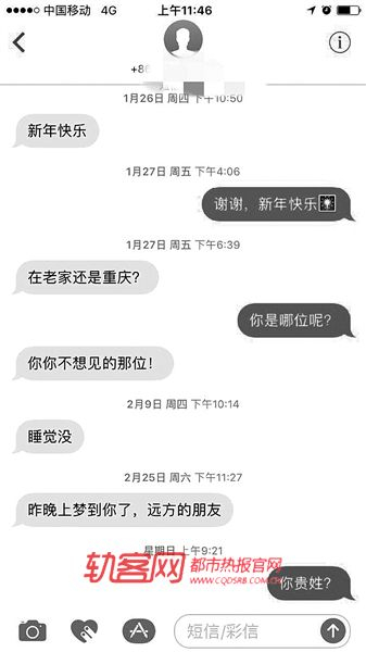 “谢谢,也祝你快乐。”收到短信后,黎小姐简单的回复,因为只是没存号码的陌生朋友,但没想到,对方很快又回复到:“在老家还是重庆呢?”
