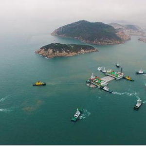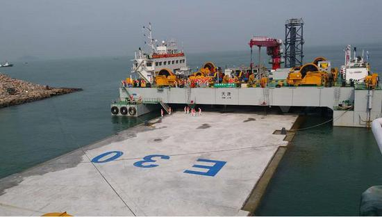 6日早上,E30由13艘大马力拖轮、10艘海事警戒船护卫,在安装船队拖带下驶往13公里外的施工海域,经过7个小时的海上浮运安全抵达系泊区。随后快速完成系泊转换、舾装件拆除、拉合系统安装等各项工作,在对现场海况、基床回淤、人员状态、船机设备等条件进行再次确认后,进行灌水下沉施工。