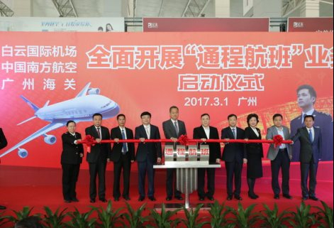 3月1日,广州海关、广州白云国际机场股份有限公司、中国南方航空股份有限公司在白云机场航站楼联合举办 “全面开展‘通程航班’业务启动仪式”。即日起经白云机场中转的南航所有国际航班旅客,可享受托运行李“一站式”直挂便利。在白云机场,南航成为国内首家获准在所有进出境航班开展国际“通程航班”业务的航空公司。