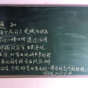昨日,记者在该校D栋宿舍楼的小黑板上看到相关通知,称已将宿舍楼每个房间的插座换为USB接口,请同学们一律不得通过任何方式使用排插、风筒等,否则将严肃处理。