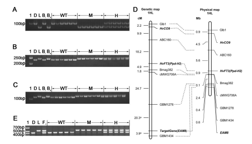 研究组在青海西宁和四川温江两地的表型鉴定结果发现,来自西藏的青稞地方品种“拉鲁青稞”开花时间比晚熟品种“迪青1号”早15-21天,生育期差异显著。通过对来自于拉鲁青稞(早熟)×迪青1号(晚熟)杂交组合的279个F2个体的表型分析,认为“拉鲁青稞”的早开花性状由单个隐性基因控制。进一步的遗传和物理图谱构建工作将该控制基因定位于1HL上并确定其为生物种基因(circadian clock genes)EAM8的隐性等位变异。亲本EAM8 的DNA和cDNA的序列分析结果表明,“拉鲁青稞”EAM8第三个内含子(intron 3)中存在的A/G替换导致该基因在转录时发生可变剪接(alternative splicing)和内含子保留(intron retention),之后提前出现的终止密码子最终导致无功能的截断蛋白(putative truncated protein)的形成,将该等位基因定名为eam8.l。在自然群体中的EAM8单体型(haplotype)检测结果表明,eam8.l存在于青藏高原野生大麦和青稞地方品种中且具有相同的早熟特性,推测该等位变异可能来自于西藏野生大麦。该研究发现的eam8.l等位基因是植物中第一个发现的可变剪接导致早熟的自然突变基因。该项研究结果不仅提示我们可变剪接可能是青稞生物钟基因进化和短生育期适应性形成的重要遗传机制之一,同时在青藏高原其它一年生植物中也可能存在相似的适应性形成机制。