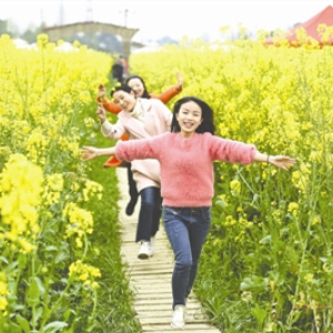 3月8日,市民在崇州市五星村油菜花田里游玩。摄影记者 张士博