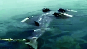 从该视频中可以看到,至少有四名身上背有气瓶的潜水员围着一条“鲸鲨”活动,“鲸鲨”尾部拴着一条绳子,固定在拍摄者所在的船身上。