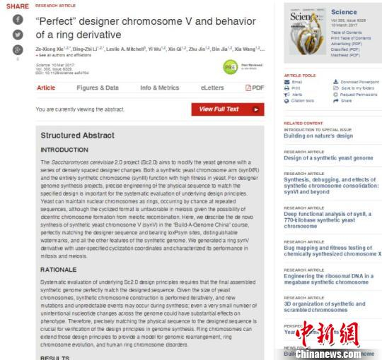 中新网天津3月10日电 (记者 张道正 通讯员 靳莹 )记者10日从天津大学获悉,天津大学、清华大学、华大基因的中国科学家日前在真核生物基因组设计与化学合成方面取得重大突破,完成了4条真核生物酿酒酵母染色体的从头设计与化学合成,打破了非生命物质与生命的界限,开启了“设计生命、再造生命和重塑生命”的进程。