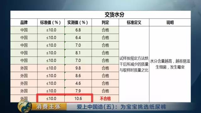 张清文 国家纸张质量监督检验中心副主任:交货水分反映的是纸尿裤中的水分含量,我们国家标准规定小于等于10%。如果纸尿裤水分高,可能会导致微生物超标,微生物超标会影响婴儿的身体健康。