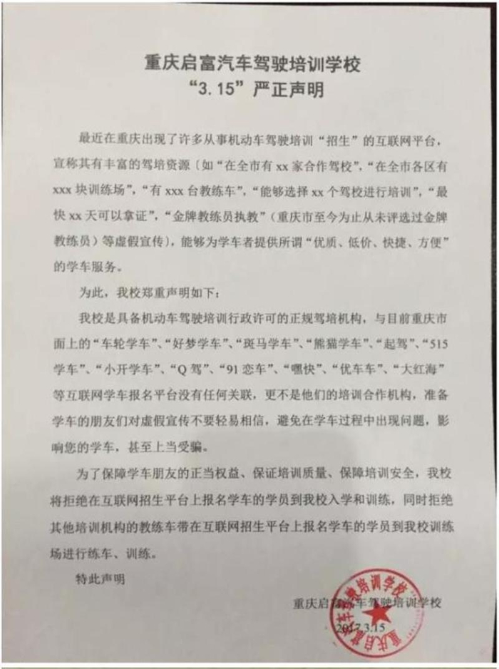在3.15之际,重庆120多家驾校共同发声,发出《“3.15”严正声明》,表示与互联网学车平台不存在任何合作关系,并拒绝来自互联网学车平台的学员入学、训练或使用场地。