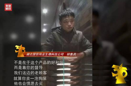 湖北国创伟业生物科技公司业务员 李业务员:一个产品能不能卖出去,不在于这个产品的好和坏,而是靠你的督导,靠你的业务员,说白了,我们这边的老顾客,就算你卖一泡狗屎,他也会情愿去买。