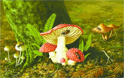 图为南京专家根据琥珀化石绘制的蘑菇和隐翅虫复原图。